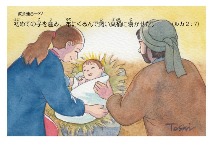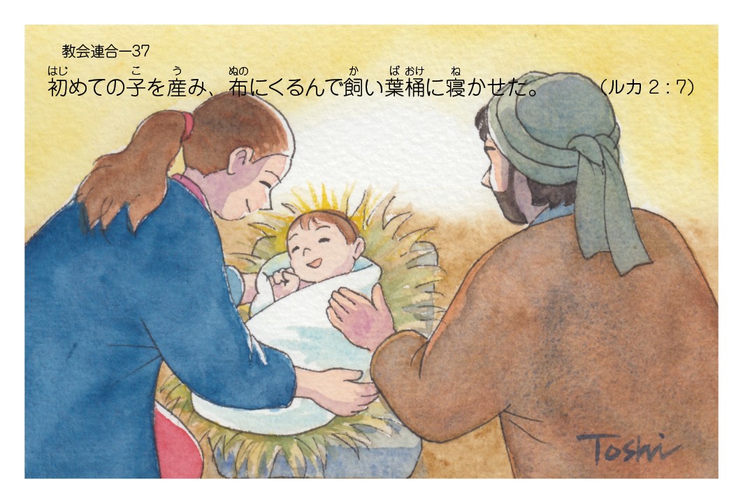 この晩、赤ちゃんはオギャーオギャーと元気に生れて来てくれました。布にくるんで飼い葉桶に寝かせます。赤ちゃんは落ち着くとにこやかに笑ってくれました(聖句カード二〇二五年度版NO.37)。これは画家の信仰のセンスですが讃美歌にも。♪きよしこの夜 み子の笑みに、新しき代の 明日の光、輝けり、ほがらかに♪