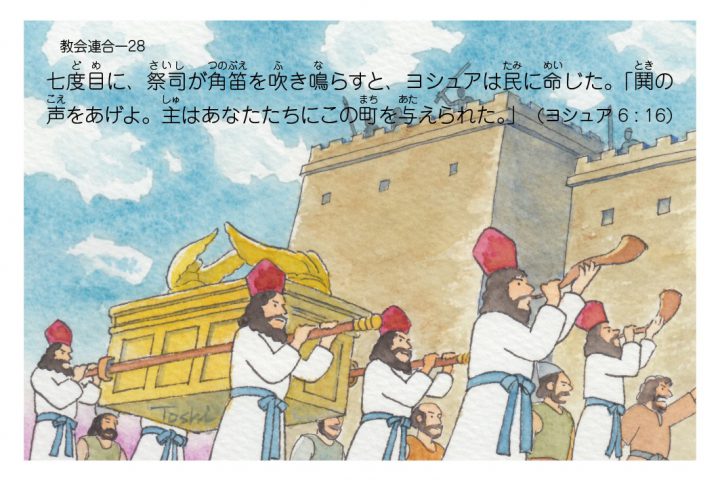 モーセの後に神さまのご命令を聞いて、民のみんなをカナンに導いたのはヨシュアでした。ヨルダン川を渡り、見えてきたのはエリコの城壁でした。当時人々は敵から守るためにグルッと城壁を築いてその中に住みました。聖句カードを見ると(二〇二五年度版No.28)、後ろに城壁があってその上に兵隊さんが見えます。神さまの約束の地に行くにはこの町は避けて通れません。