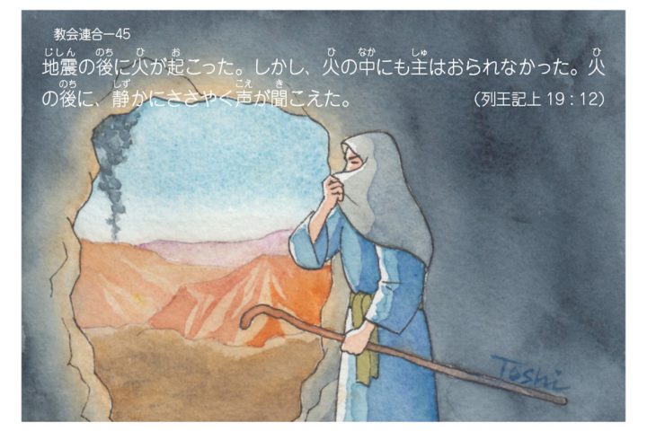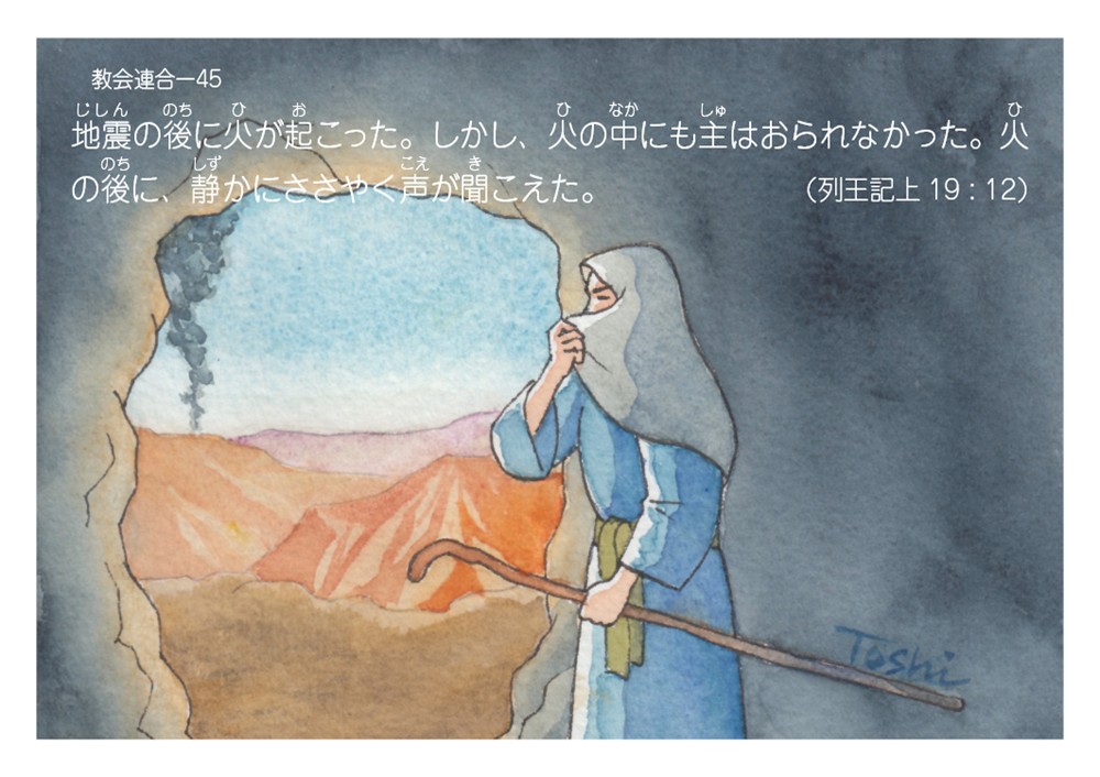 主はエリヤに促します。「そこを出て、山の中で主の前に立ちなさい」。洞穴の外では、主が通り過ぎて行かれて、主の御前には、ビューッゴーッと非常に激しい風が起こりました。山を裂き、岩を砕くほどのものです。それからグラグラッと地震も起こりました。それからボーッボーッと火も燃えていました。でもそれらの中には主はおられませんでした。そしてその後のことです。静かにささやく声が聞こえました(同一二節)。どのようなお言葉だったのでしょう? 聞き取れなかったかも知れません。でもエリヤは主なる神さまがおられると感じました。神さまを見ないように外套で顔を覆いながらも、洞穴の入口に立ち、主の御前に出て来ました(聖句カードNo.45)。